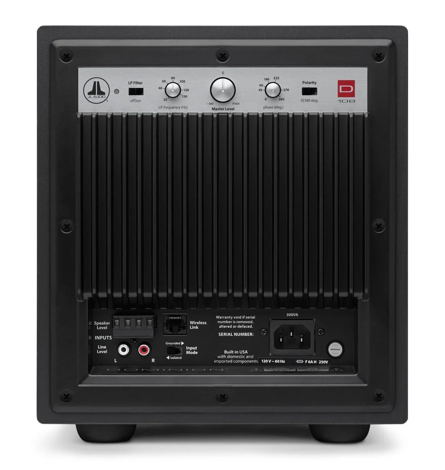 With a host of signal processing features included, Dominion® powered subwoofers can be integrated into most systems with ease. Low-pass signals are precisely guided, thanks to the onboard crossover’s 24 dB/octave Linkwitz-Riley alignment. Phase and polarity controls are onboard to aid in achieving the optimal acoustic transition between the subwoofer(s) and main speakers. Flexible input options are on-hand to accept either line-level or speaker-level signals. Connect a JLINK™ TRX system (sold separately) to the onboard Wireless Link port and enjoy the freedom to position your Dominion® almost anywhere, up to 100 feet (30 meters) away from your source unit.