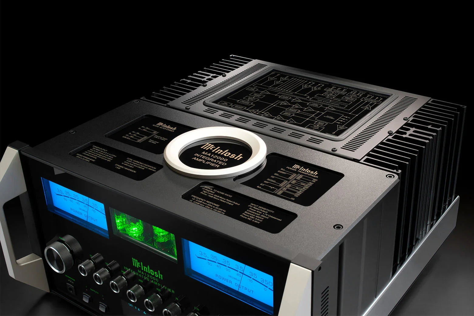 The MA12000 features the iconic McIntosh aesthetic with a polished stainless steel chassis and classic black glass front panel, complete with the signature blue-meters, and green-lit illuminated logo. This design not only ensures a visually stunning presence in any setting but also houses the delicate internal components securely, providing vibration resistance and robust durability.